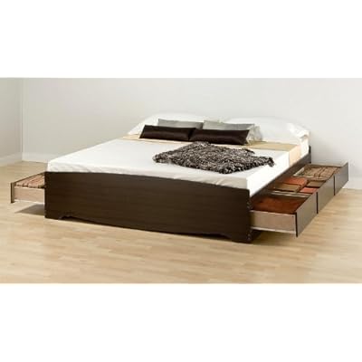 Our King Platform Storage Beds combine extra large drawers for plenty of storage space with a slat support system that requires only a mattress. Wood slats are positioned lengthwise to distribute body weight evenly, minimize the amount of motion transfer and take the place of a box-spring. Metal braces under the slats provide additional stability. Underneath are 6 large storage drawers (20in. depth) that run on smooth running metal drawer glides. Drawers open easily with finger pulls located at the bottom of drawer fronts and knobs have been eliminated to prevent bedclothes from catching. They are large enough to hold anything you need to store: linens, blankets, clothes, socks and even shoes are just a few ideas. Coordinate with the King Headboard and other Prepac bedroom furniture pieces. Overall bed height is 21 in. if used with an 8 in. thick mattress. This product is made from composite woods with plywood slats. It ships flat-packed (in three cartons) and self-assembly is required. Detailed and easy-to-follow instructions are included. 5 year manufacturer limited warranty.